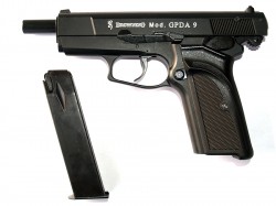 La GPDA 9, al igual que otros modelos de Umarex, es un arma de gran calidad: los mecanismos de disparo, seguro ambidextro y retenida de la corredera funcionan exactamente como en el modelo original. Los marcajes son asimismo iguales que en la pistola real, ofreciendo al coleccionista una pieza sobresaliente en todos sus detalles.